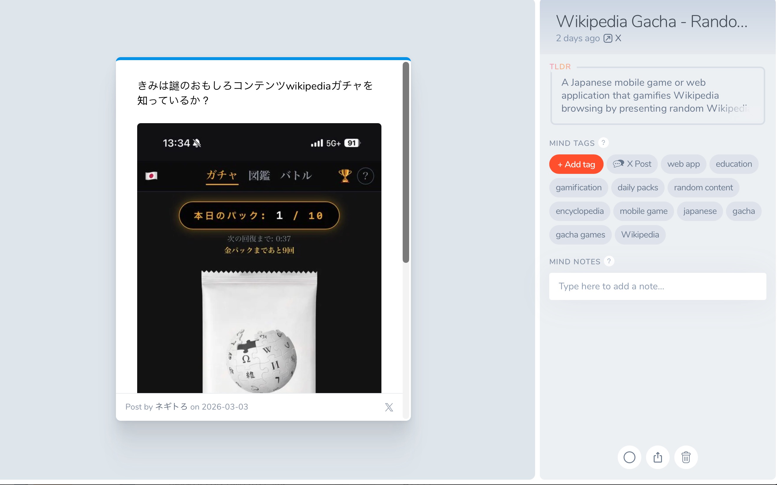 我目前用到的功能其實沒有太多,就只是把自己覺得好的文章、圖片、影片、喜歡的音樂、書籍...等丟進去 mymind 裡面。我自己對於 mymind 的期待會是讓 AI tagging 和 summary 發揮作用,之後再找相關內容時會很方便,就不用擔心資料夾分類、筆記的命名...等(我的檔案管理系統邏輯一直在變,一直無法找到一個滿意的方式),讓自己專注在「收集」和未來的「發現」。